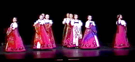 left ABT and had returned back home. Every summer I taught for his summer intensive dance workshop with students from all over the country. “Khatchaturiana” was staged there twice, at the famous Lobero Theater, with costumes loaned from my Tucson Kalinka Russian dance group. I was able to use professional dancers from his company along with the students for this. One summer the Kalinin Russian Gypsy dance group, led by Alexander Kalinin performed an exciting presentation that they had done for quite a while in Las Vegas. It included my “Yablochka” [Russian Sailor’s Dance] that I had originally choreographed in Tucson, but this time with Sergei Domrachev from Moscow dancing one of the sailors, with gusto and high professionalism. Also, my own “Khorovod” [a Russian woman’s round dance] was on the same program. This is a dance with long skirts that reach to the floor, called "serafans" in Russian. Feet unseen, the dancers, skim across the stage in patterns, as if on roller skates. People often ask me how they do that. I answer that only the choreographer knows. It was the same choreography that my Kalinka group in Tucson were doing, and with the same costumes that I brought with me. Being professional dancers they performed it much nicer, but without the full orchestra and chorus as in Tucson. Later, both these dances of mine were performed at the Hollywood Bowl.